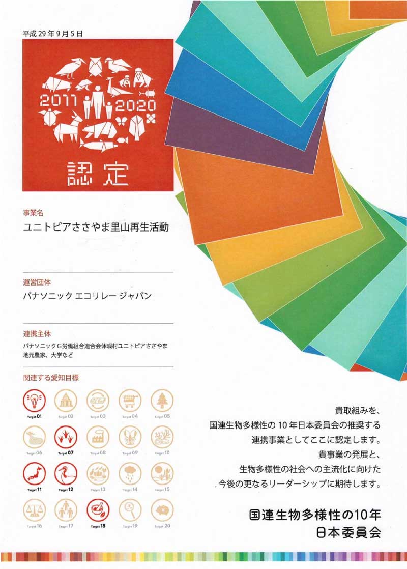 この度、パナソニックエコリレージャパンが活動を展開している「ユニトピアささやま里山再生活動」が『国連生物多様性の10年連携事業』に認定されました。これからも皆様と共に、楽しみながら「持続可能な社会づくり」に貢献してまいります。