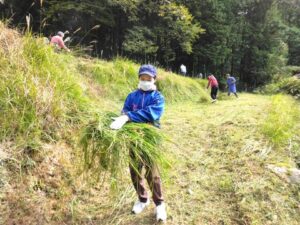 2022年10月活動 活動日: 2022年10月22日(土) 甲南女子大学、パナソニック松愛会、フォレスター松寿、 一般社団法人 山守、パナソニックエコリレージャパンから 総勢40名が参加。 獣害対策ネットの設置、田んぼと榾木の後片付け、周辺草刈り、水路整備、 生き物調査など、役割分担しながら作業を行ないました。